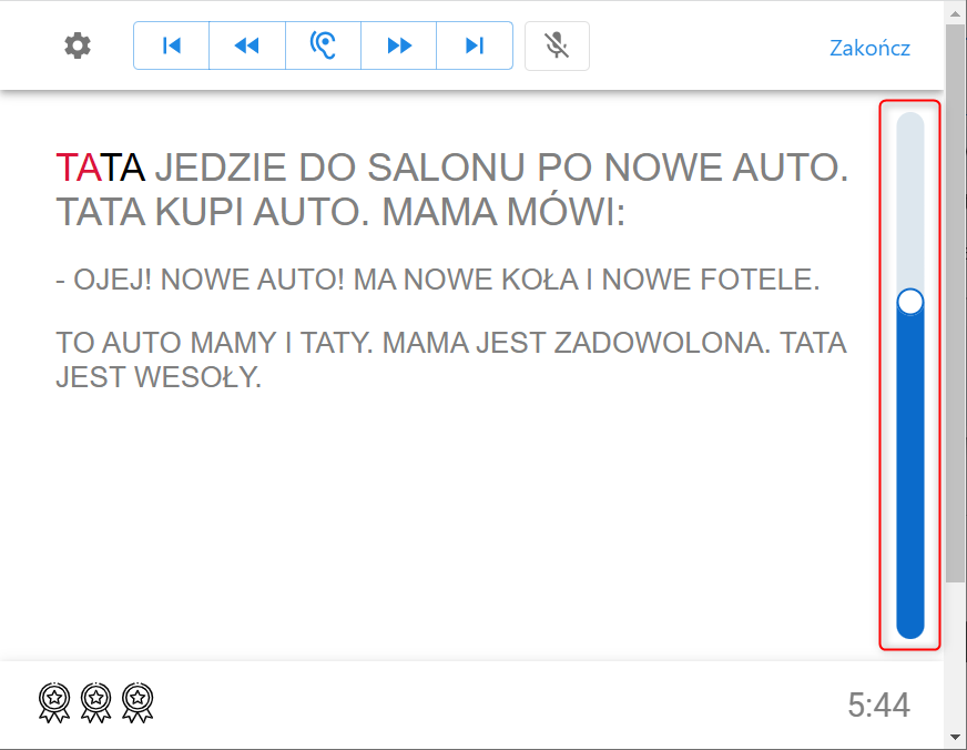 Jeśli konfiguracja audio jest poprawna, wskaźnik głośności po prawej stronie ekranu czytanki będzie reagował na głos.