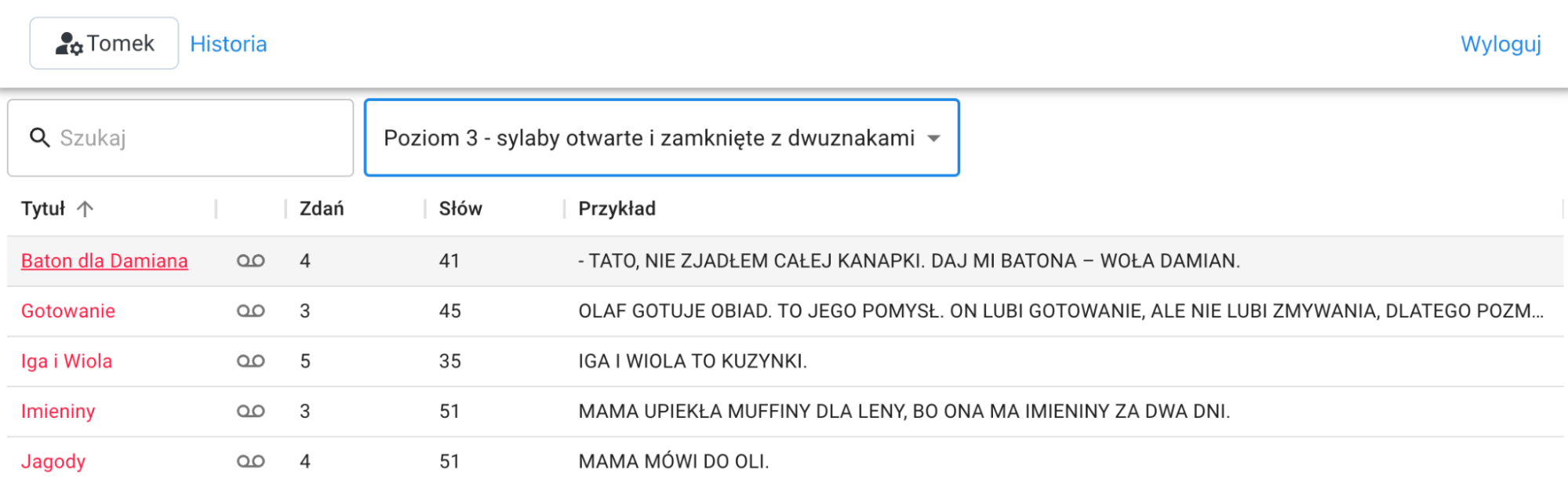 Po kliknięciu tytułu wybranej czytanki rozpoczniemy ćwiczenie.