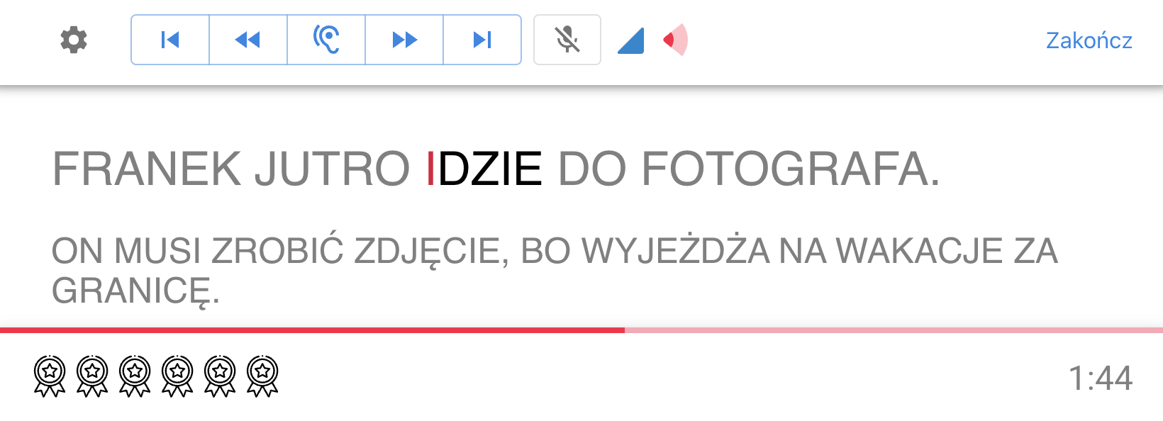 Ćwiczenie polega na próbie czytania wyświetlanego tekstu. Tekst podzielony jest na fragmenty (zwykle na zdania lub na kilka krótszych zdań). Aby ułatwić śledzenie tekstu, aktualnie czytany fragment (zdanie) jest wyróżniony większą czcionką, a czytany wyraz ma wyróżniający kolor. Do poprawnego działania program wymaga dostępu do mikrofonu w komputerze. Przy pierwszym uruchomieniu pojawi się monit z prośbą o udostępnienie mikrofonu. Wyrażenie zgody jest konieczne do poprawnej pracy programu.