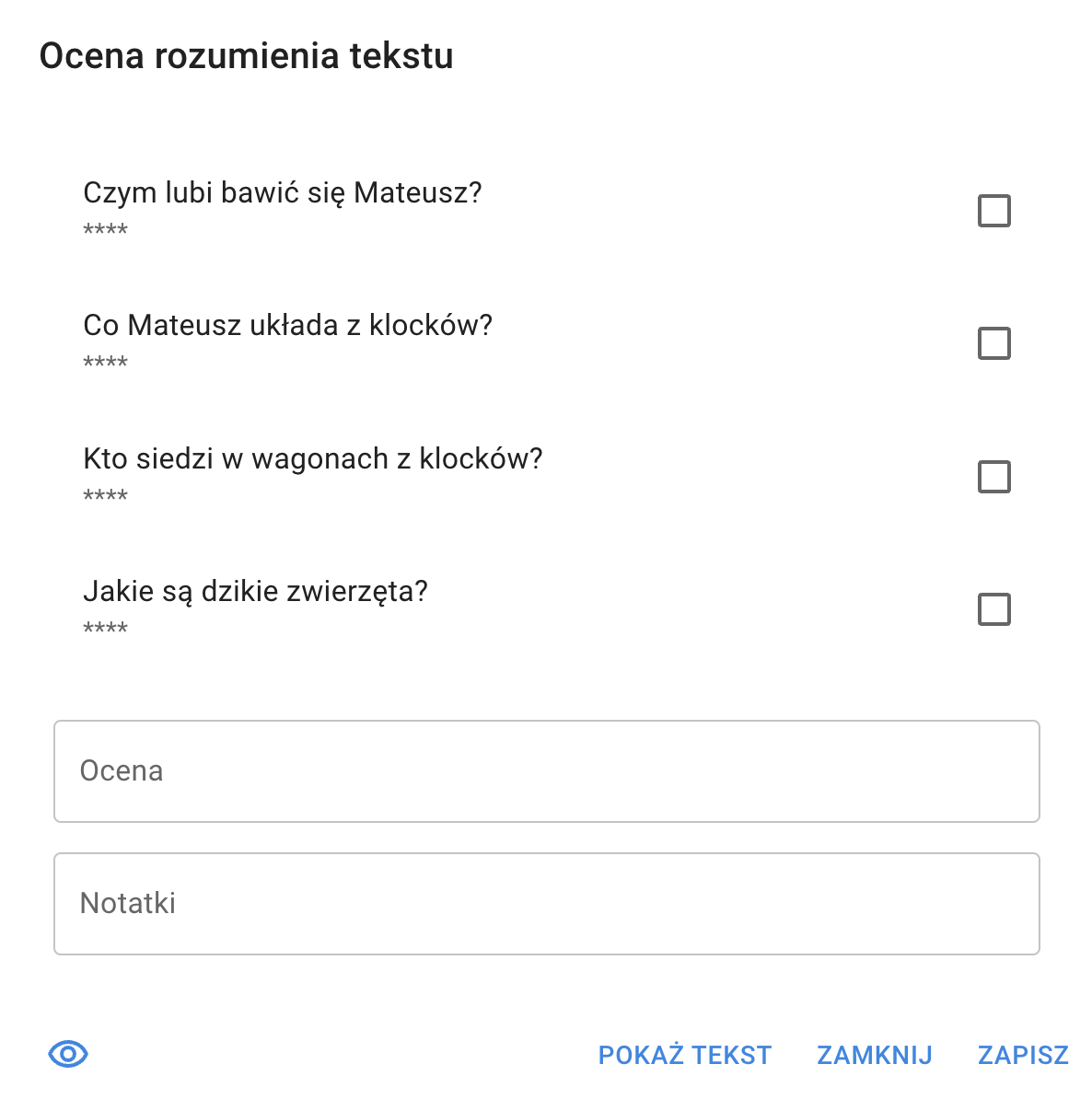 umożliwia wprowadzenia lub modyfikację oceny zrozumienia tekstu.